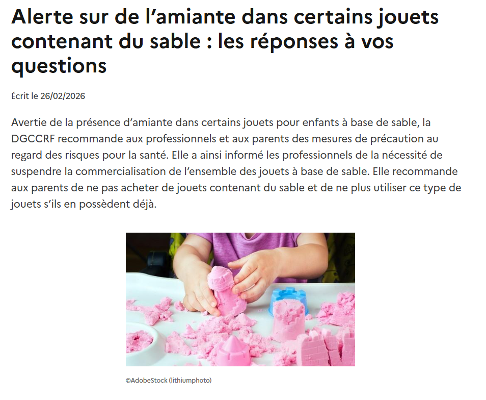 Pour plus d’informations : https://www.economie.gouv.fr/dgccrf/actualites-dgccrf/alerte-sur-de-lamiante-dans-certains-jouets-contenant-du-sable-les-reponses-vos-questions.