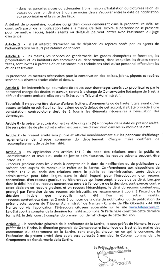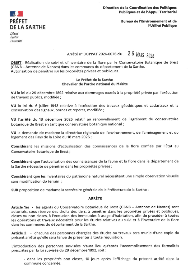 Arrêté préfectoral autorisant les agents du Conservatoire Botanique de Brest, en vue des études relatives au suivi et à l’inventaire de la flore dans le département de la Sarthe, à pénétrer dans les propriétés privées sises sur le territoire de votre commune.