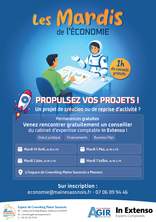 - A partir du Mardi 14 Avril à l’espace de coworking de Mamers, Michel Bouillon, conseiller en création-reprise d’entreprise au cabinet d’expertise comptable In Extenso tiendra des permanences tous les 1ers mardis de chaque mois. Vous pourrez bénéficier de conseils GRATUITS. Puis les Mardis 5 Mai, 2 Juin, 7 Juillet : cf affiche en pj.