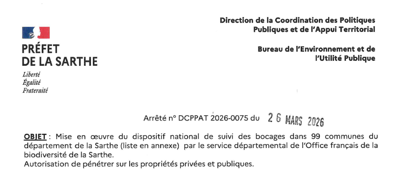 Arrêté préfectoral autorisant les agents du service départemental de l’Office français de la biodiversité, en vue des études relatives au dispositif national de suivi des bocages dans 99 communes du département de la Sarthe, à pénétrer dans les propriétés privées sises sur le territoire de votre commune.