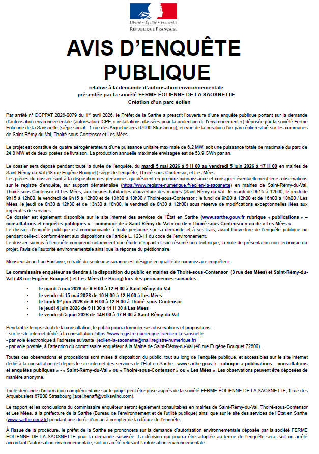 Le commissaire enquêteur se tiendra à la disposition du public en mairies de Thoiré-sous-Contensor (3 rue des Mées) et Saint-Rémy-du-