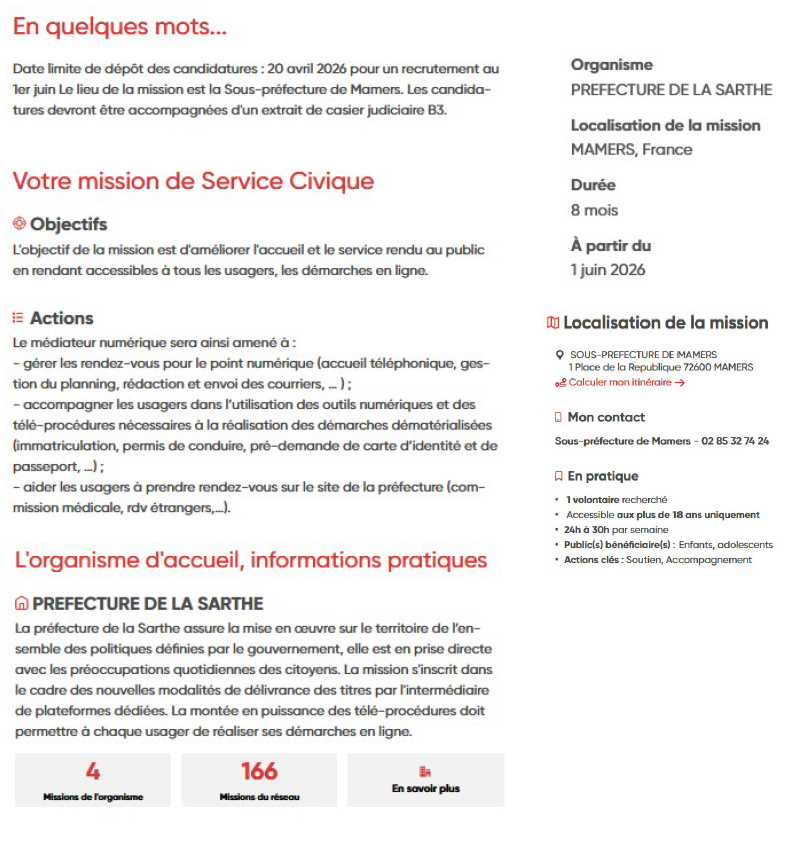 La Sous-préfecture de Mamers recherche un volontaire en service civique afin d’effectuer une mission en tant que « Médiateur numérique auprès des usagers » à compter du 1er mai 2026.